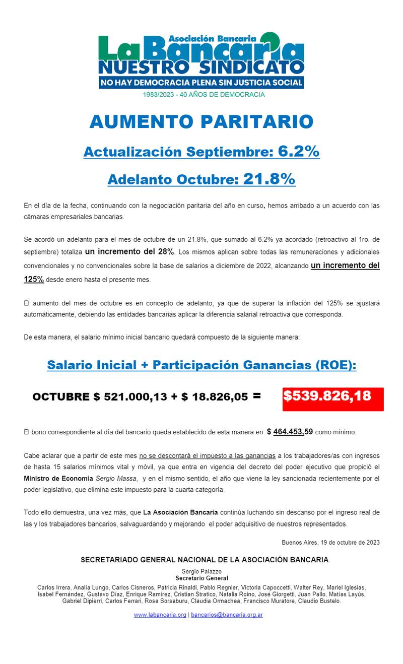 De esta forma, el salario mínimo quedó fijado en $ 539.826 para todos los trabajadores afiliados al sindicato de la Asociación Bancaria. "El aumento de octubre es en concepto de adelanto, ya que de superar la inflación del 125% se ajustará automáticamente, debiendo las entidades bancarias aplicar la diferencia salarial retroactiva que corresponda", señalaron desde el gremio.
