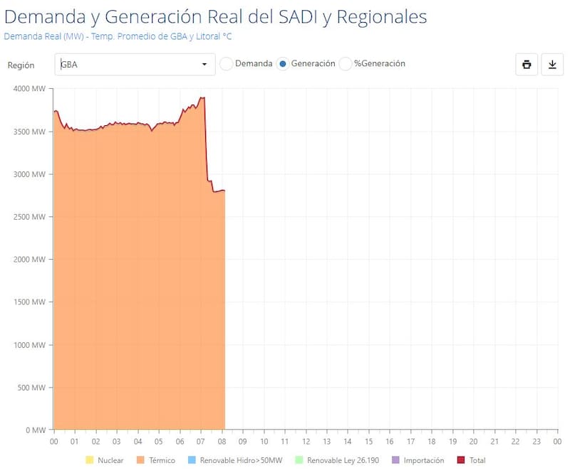 En el sitio de la Compañía Administradora del Mercado Mayorista Eléctrico S.A. (CAMMESA), se reportó un corte de cerca de 400 MW, el equivalente a casi un 24% la demanda de energía.
