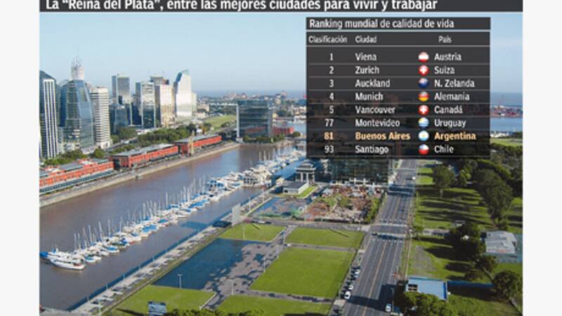 La capital de la Argentina alcanzó el puesto 81 entre 223 ciudades de todo el mundo, la misma posición que ostentaba el año anterior. Pero si se tiene en cuenta sólo a las ciudades sudamericanas, se ubicó nada menos que en el segundo lugar entre las ciudades con mejor calidad de vida.