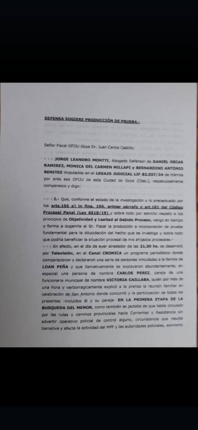Jorge Leandro Montti, abogado defensor de Daniel Oscar Ramírez, Mónica del Carmen Millapi y Bernardino Antonio Benítez, sugirió la incorporación de una fotografía difundida recientemente y la citación de todas las personas presentes en dicha imagen. Según Montti, la foto muestra a varios individuos que participaron en la primera etapa de la búsqueda de Loan y que hicieron declaraciones públicas sobre el caso. Montti argumentó que la presencia de estas personas en la fotografía y sus declaraciones televisivas podrían ser de gran importancia para esclarecer los hechos y podrían incluso revelar inconsistencias en los testimonios.