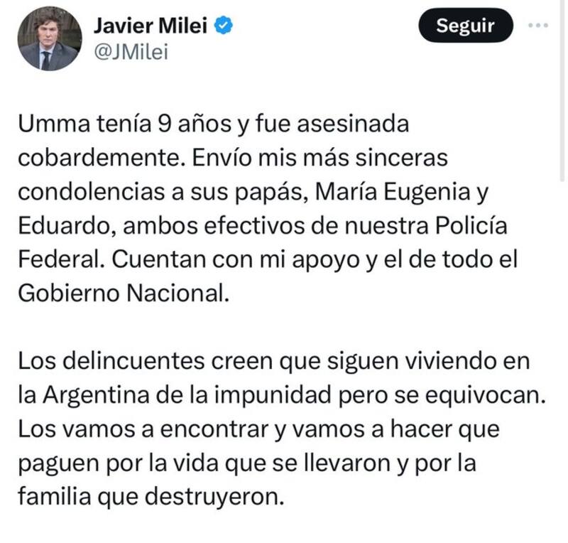 "Umma tenía 9 años y fue asesinada cobardemente. Envío mis más sinceras condolencias a sus papás, María Eugenia y Eduardo, ambos efectivos de nuestra Policía Federal. Cuentan con mi apoyo y el de todo el Gobierno Nacional. Los delincuentes creen que siguen viviendo en la Argentina de la impunidad, pero se equivocan. Los vamos a encontrar y vamos a hacer que paguen por la vida que se llevaron y por la familia que destruyeron", escribió el presidente Javier Milei en la red social "X".