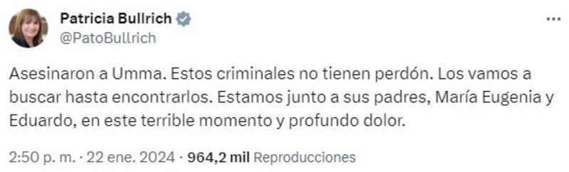 "Asesinaron a Umma. Estos criminales no tienen perdón. Los vamos a buscar hasta encontrarlos. Estamos junto a sus padres, María Eugenia y Eduardo, en este terrible momento y profundo dolor", escribió Bullrich.