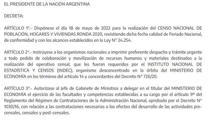 "Dispónese el día 18 de mayo de 2022 para la realización del CENSO NACIONAL DE POBLACIÓN, HOGARES Y VIVIENDAS RONDA 2020, revistiendo dicha fecha calidad de Feriado Nacional, de conformidad y con los alcances establecidos en la Ley N° 24.254", señala el texto firmado por el presidente Alberto Fernández; el jefe de Gabinete, Juan Manzur y el ministro de Economía, Martín Guzmán.