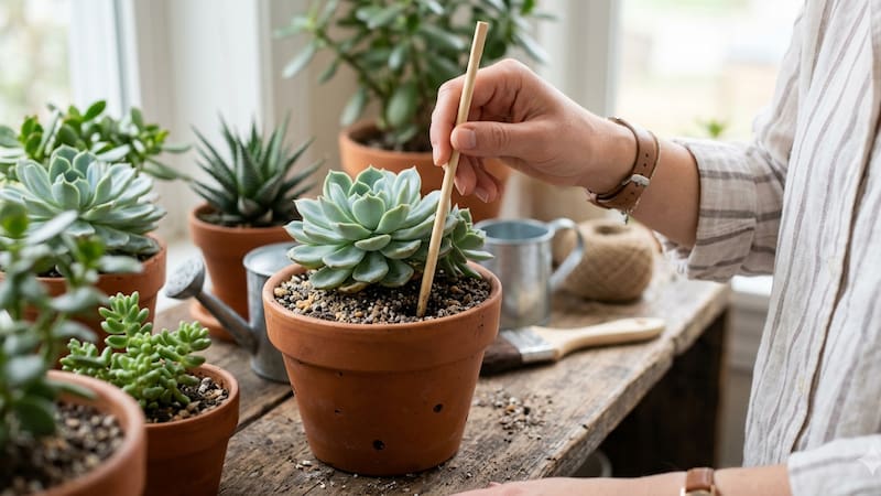 El palito es especialmente recomendable en determinadas circunstancias. Durante el otoño y el invierno, las suculentas reducen su actividad y necesitan menos agua, por lo que el riesgo de pasarse aumenta. También conviene usarlo cuando la maceta no tiene buen drenaje o cuando hay dudas sobre el estado interno de la tierra, que por fuera puede parecer seca aunque en profundidad conserve humedad.