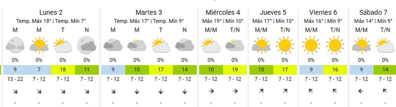 Para el primer día de la semana, se espera un cielo algo nublado por la mañana y parcialmente nublado por la tarde/ noche. La temperatura mínima será de 7°, mientras que la máxima será de 18°.