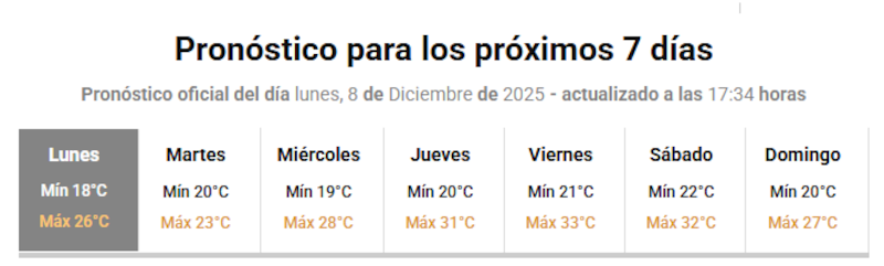 A partir del miércoles el panorama mejora, con nubosidad variable y temperaturas en ascenso. Ese día se espera una máxima de 28°C, mientras que el jueves el termómetro podría trepar hasta los 31°C. La tendencia continuará el viernes, que se perfila como la jornada más calurosa, con una máxima estimada en 33°C. El sábado mantendrá condiciones similares, con valores que rondarán los 32°C y sin probabilidad de precipitaciones.
