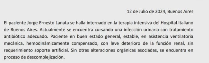 "El paciente se halla internado en la terapia intensiva del Hospital Italiano de Buenos Aires. Actualmente se encuentra cursando una infección urinaria con tratamiento antibiótico adecuado", asegura el comunicado del hospital.