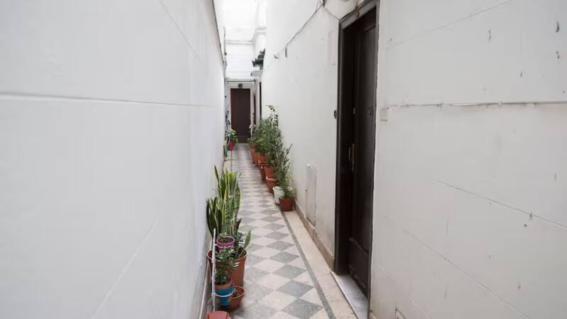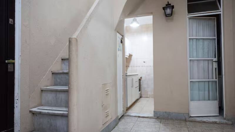 Se trata de un PH de 87 m² con entrada por una de dos puertas blancas idénticas que dan a un pasillo largo. Desde ahí se accede a la vivienda compuesta por cuatro ambientes: una habitación principal, una más pequeña, un comedor, una cocina compacta y un baño.