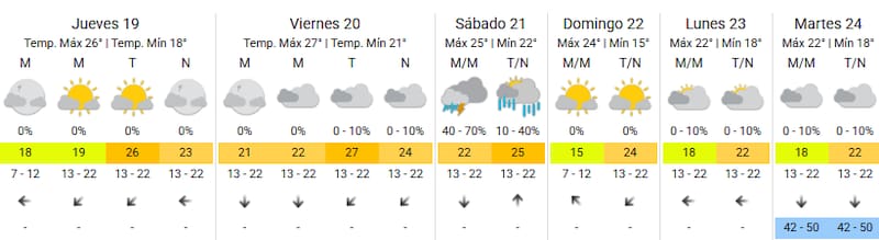 El viernes 20 será el día más caluroso del período, con una máxima de 27 grados y una mínima de 21. Si bien se mantendrá la estabilidad, comenzará a aumentar la nubosidad hacia el cierre de la jornada.