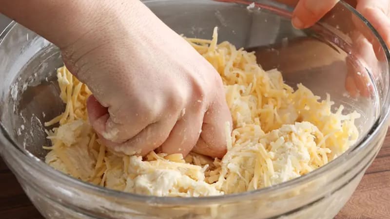 - En un recipiente, combinar el almidón de mandioca con el queso desmenuzado y la sal.