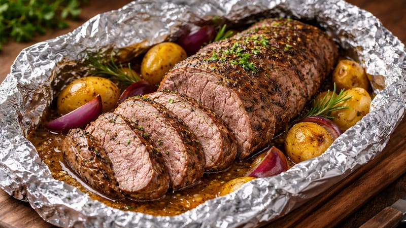 El aluminio actúa como una barrera que retiene el vapor durante la cocción, generando un efecto similar al de una cocción al vapor dentro del horno, lo que ayuda a evitar que el lomo se reseque.