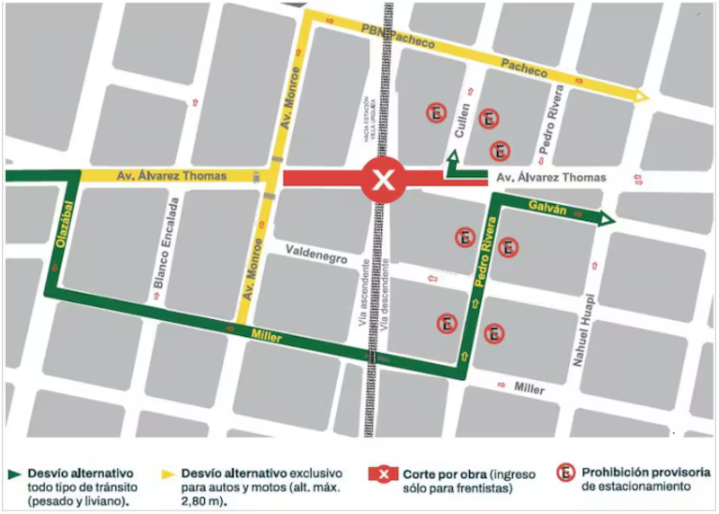 En paralelo, se aplicaron restricciones de estacionamiento sobre las calles Pedro Rivera (entre Miller y Galván) y Cullen (entre Pacheco y Álvarez Thomas) para evitar embotellamientos en las rutas de desvío.