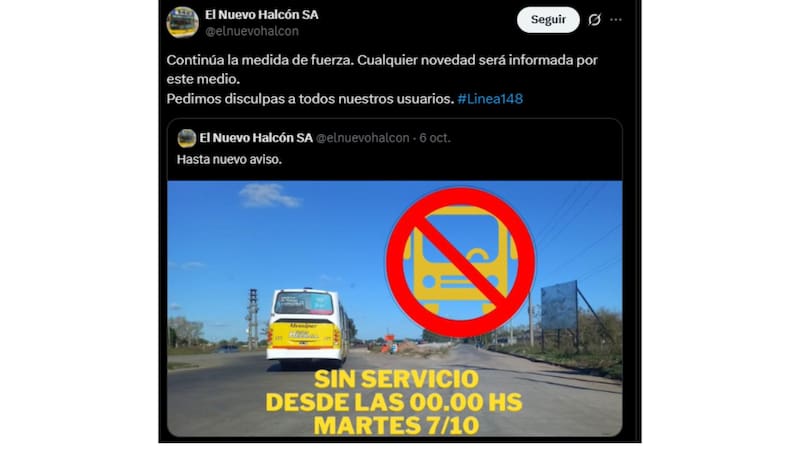 A través de su cuenta de X, la empresa El Nuevo Halcón S.A. informó que ese extenderá la medida de fuerza. "Continúa la medida de fuerza. Cualquier novedad será informada por este medio. Pedimos disculpas a todos nuestros usuarios", detallaron en el tuit.