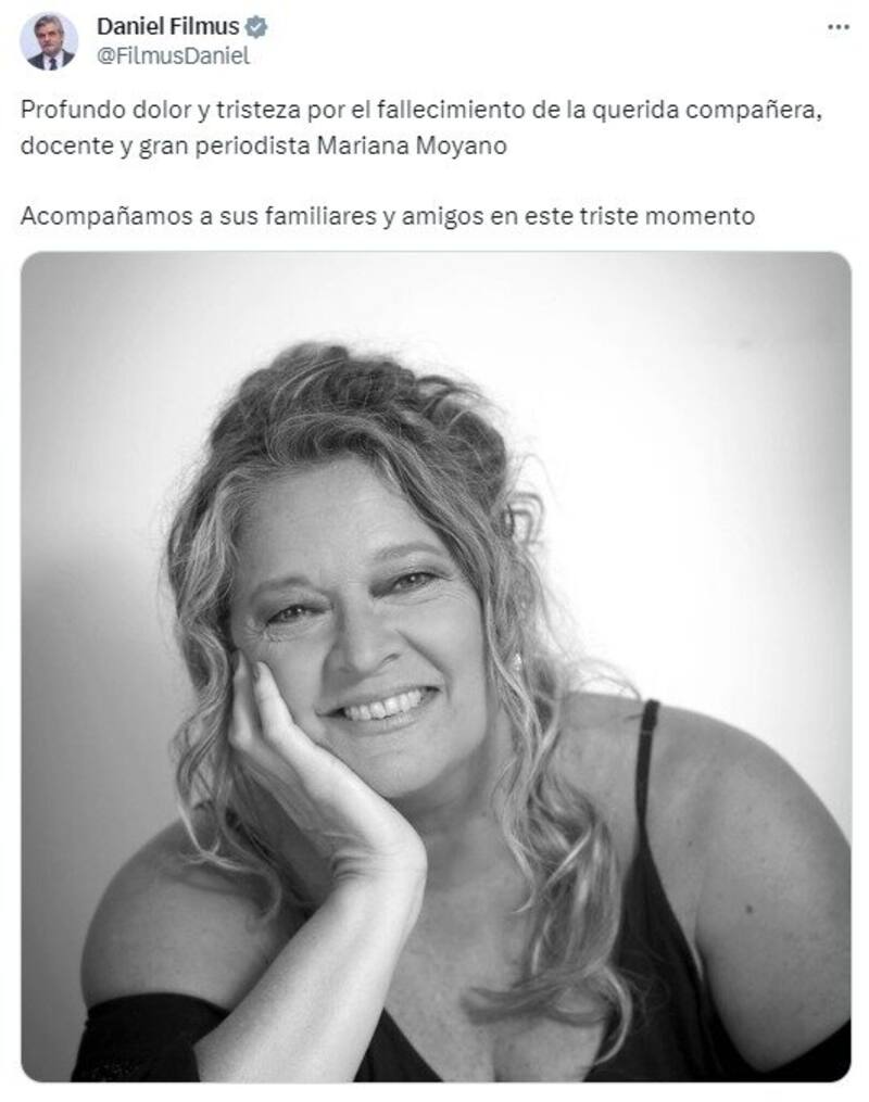Por su parte, el ministro de Ciencia, Tecnología e Innovación, Daniel Filmus, publicó: "Profundo dolor y tristeza por el fallecimiento de la querida compañera, docente y gran periodista Mariana Moyano. Acompañamos a sus familiares y amigos en este triste momento".