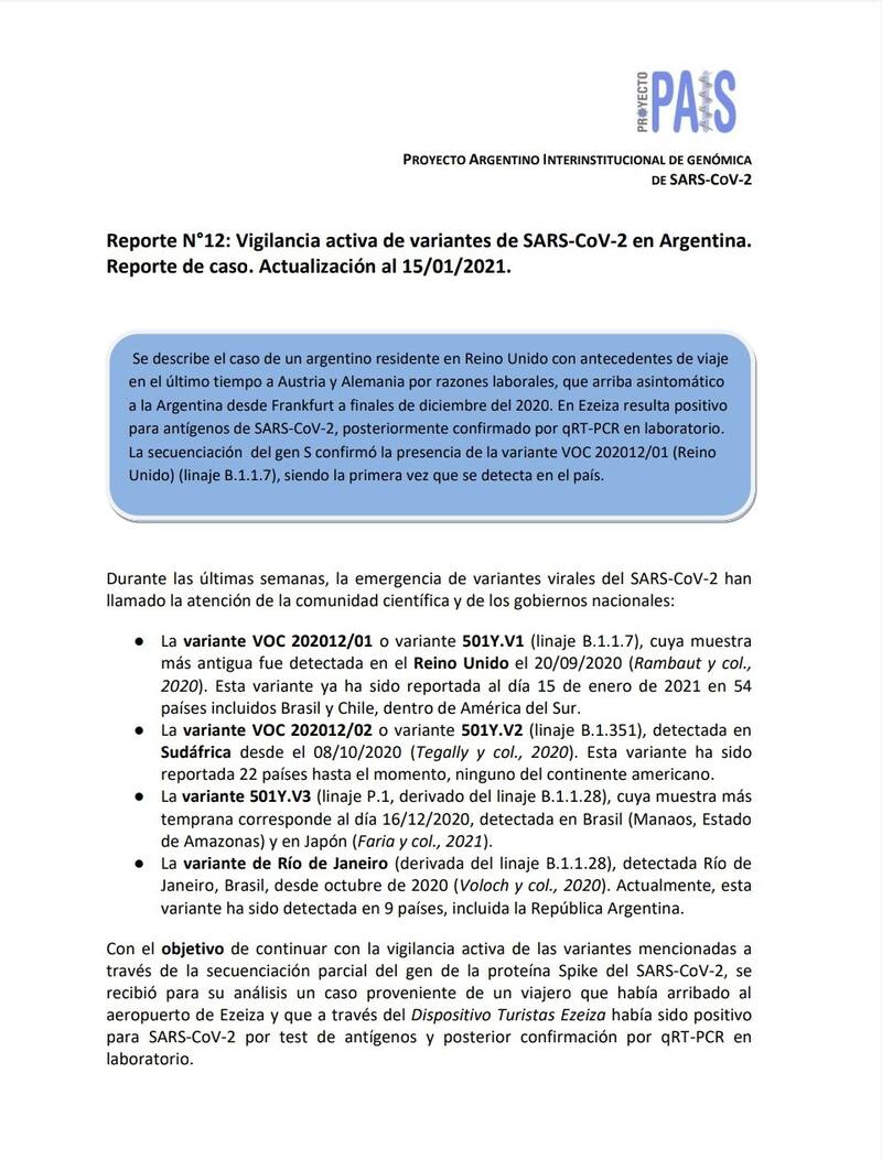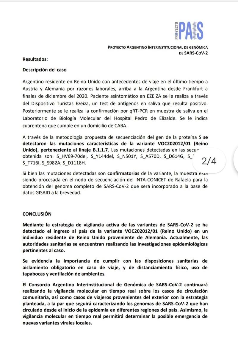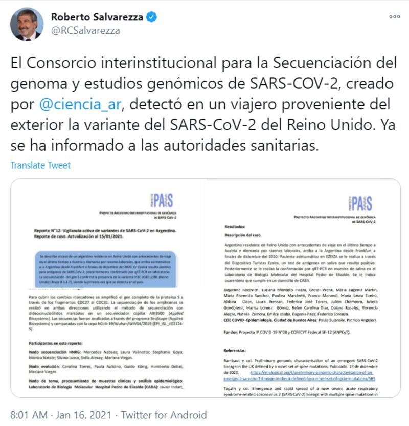 El Consorcio interinstitucional para la Secuenciación del genoma y estudios genómicos de SARS-COV-2, creado por el Ministerio de Ciencia, "detectó el ingreso al país de un argentino residente en Reino Unido, con antecedente de viaje con antecedente de viaje a Austria y Alemania por razones laborales, que arriba asintomático a la Argentina desde Frankfurta fin de diciembre de 2020 y en Ezeiza resulta positivo de antígenos SARS CoV 2", informó Salvarezza esta mañana en Twitter.