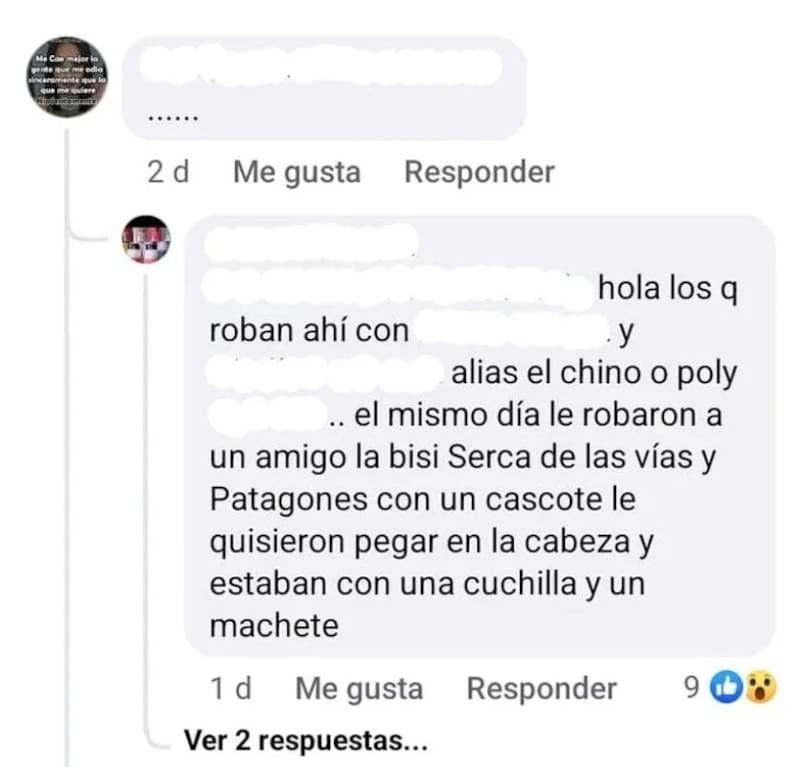 "Hola, los que roban ahí son David S... e Hipólito C... alias 'el Chino' o 'Poly'. El mismo día le robaron a un amigo la bici cerca de las vías y Patagones. Con un cascote le quisieron pegar en la cabeza y estaban con una cuchilla y un machete", alertaba el comentario.