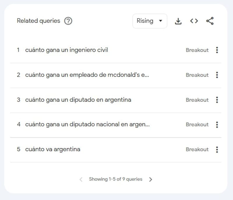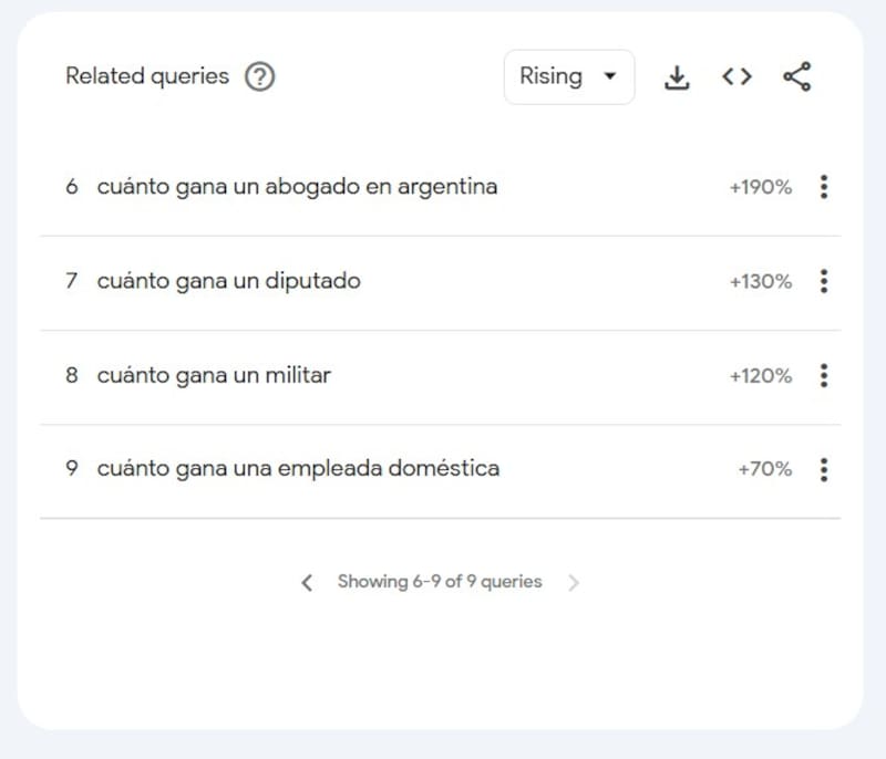 Y en el último lugar de las consultas explosivas aparece algo que no es tiene que ver con salarios: “cuánto va argentina”, que nos define cómo la búsqueda de una cifra tiene más de un hallazgo posible.