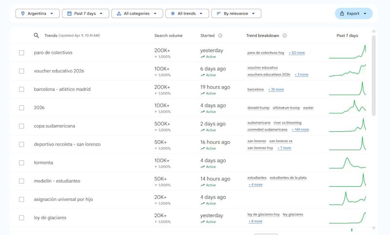 El paro de colectivos se lleva la punta del ranking este 9 de abril como el tema con mayor relevancia. Al ser una urgencia que afecta directamente a las personas, el volumen de búsquedas superó las 200.000 consultas en pocas horas.