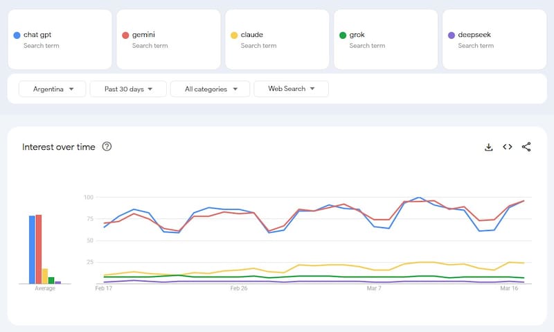 Los datos muestran un empate técnico constante. Son las dos inteligencias artificiales con mayor volumen de búsqueda, pero las dudas de los argentinos van por carriles distintos.