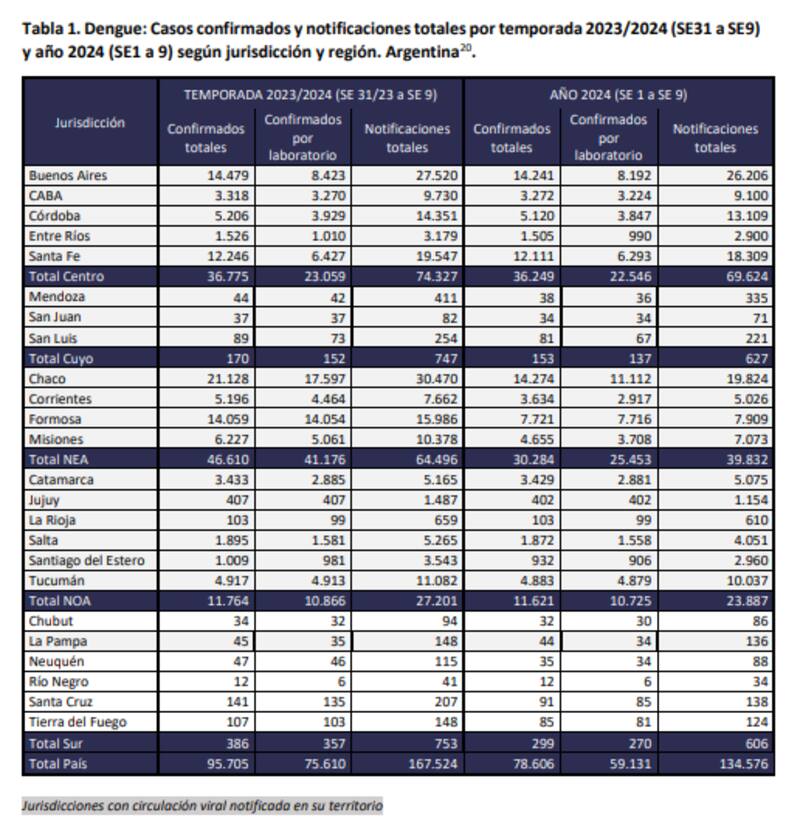 "Durante las últimas semanas epidemiológicas, se detectaron 68 casos de coinfección de serotipos DEN-1 y DEN-2, correspondientes a las regiones NEA y Centro. No se asociaron a casos fallecidos", indicó el informe.