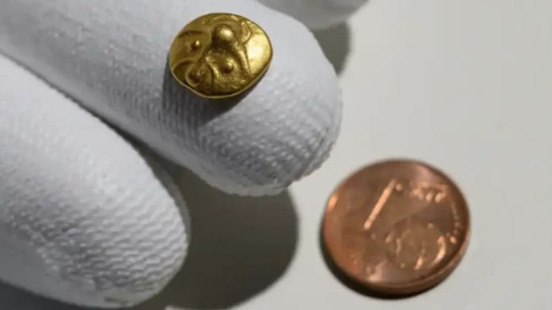 El tesoro encontrado en el campo de Gundorf es una moneda de oro pequeña, cuyo tamaño es más chico que un céntimo de euro. Su diseño único resalta porque en el anverso tiene tallada la cabeza de un animal que posiblemente sea un ciervo.