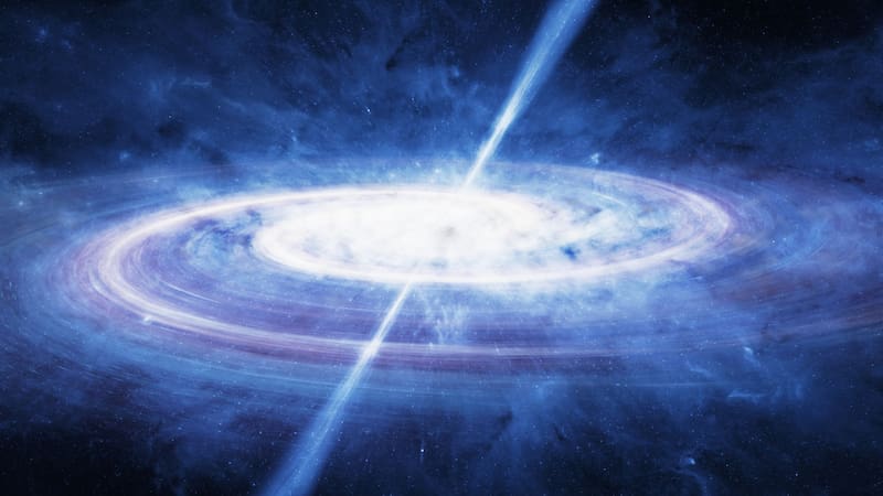Los cuásares son núcleos de galaxias activas que brillan con tal intensidad que superan a todas sus estrellas. En este caso, el cuásar contiene un agujero negro 20.000 millones de veces más masivo que el Sol, capaz de generar la energía de mil billones de soles.