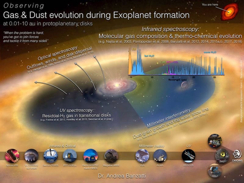 El telescopio se enfoco en ver si los discos compactos tienen una mayor abundancia de agua en la región rocosa del planeta interior, como se esperaba si la deriva de las rocas es más eficiente y entrega masa sólida y agua a los planetas interiores.