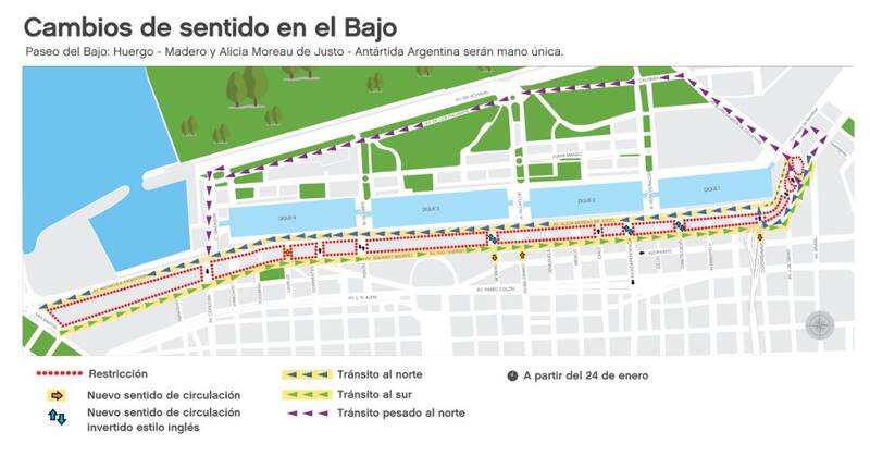 Las avenidas Eduardo Madero e Ingeniero Huergo serán mano única hacia el sur y av. Alicia Moreau de Justo/av. Antártida Argentina tendrán sentido único hacia el norte. Además, la red de tránsito pesado deberá circular en dirección al norte por av. Elvira Rawson de Dellepiane, av. Calabria, av. de los Italianos y Cecilia Grierson. En sentido sur, continuarán circulando por av. Eduardo Madero/av. Ingeniero Huergo.