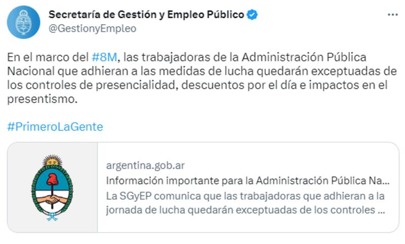 "En el marco del #8M, las trabajadoras de la Administración Pública Nacional que adhieran a las medidas de lucha quedarán exceptuadas de los controles de presencialidad, descuentos por el día e impactos en el presentismo", detalló el ente nacional.