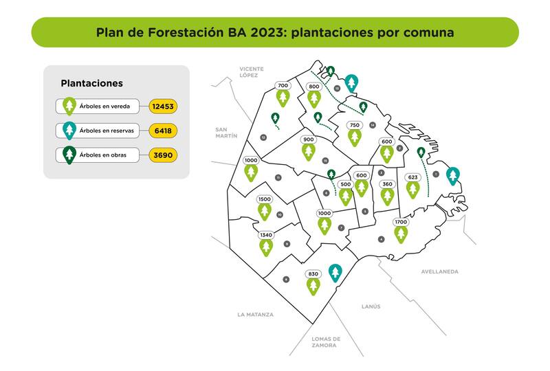 A la Comuna 9 (Liniers, Mataderos y Parque Avellaneda), llegarán 1340 unidades; Las comunas 7 (Flores y Parque Chacabuco) y 11 (Villa General Mitre, Villa Devoto, Villa del Parque y Villa Santa Rita) tendrán una participación similar con 1000 árboles en cada caso; la 15 con 900; la 8, con 830; y la 13 con 800. Por debajo de esa cifra se ubican al resto de las comunas, con entre 750 y 360 unidades a plantar en zonas de sus distintos barrios.