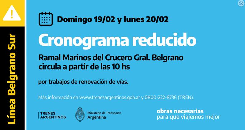 Trenes Argentinos informó que el ramal Marinos del Crucero General Belgrano empezará a circular en ambos días a partir de las 10:00 por "trabajos de renovación de vías".