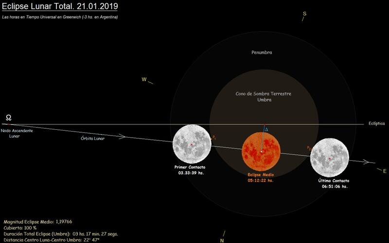 El último eclipse lunar total visible desde Argentina tuvo lugar entre el 20 y el 21 de enero de 2019.