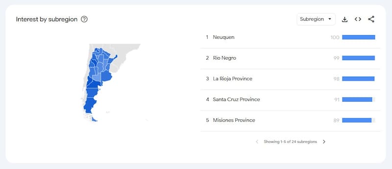 No todo el país estuvo igual de pendiente de este fenómeno. Según el mapa de interés por subregión, Neuquén lideró el ranking de actividad con 100 puntos. Le siguieron Río Negro con 99 y La Rioja con 98.
