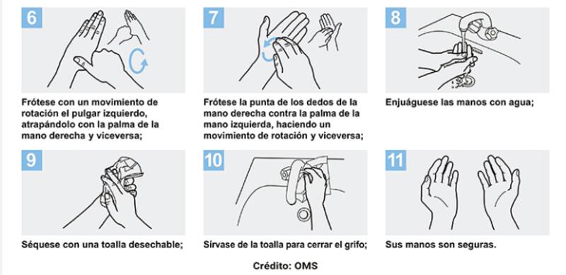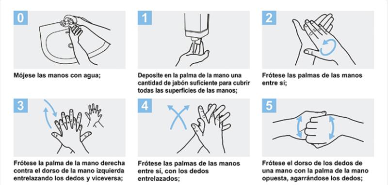 - El lavado de manos con agua y jabón debe realizarse siguiendo los pasos indicados en la ilustración.