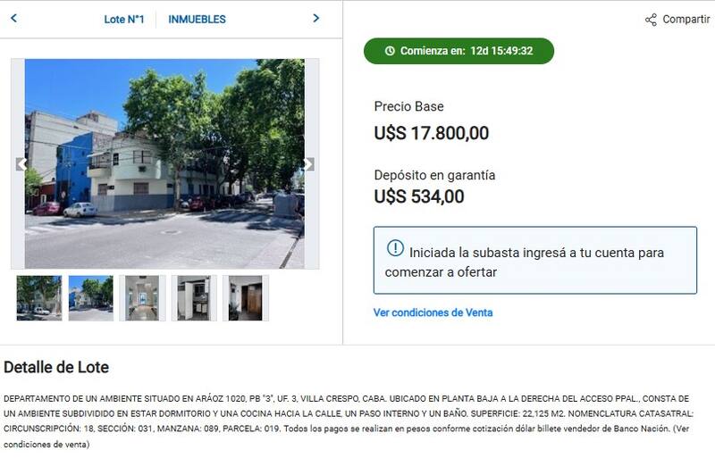 Con respecto a los departamentos, la opción más barata que atrae a los compradores es en Villa Crespo. Se trata de un departamento de un ambiente en una planta baja sobre la calle Aráoz con un precio base de u$s 17.800.