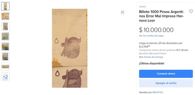 Una de las páginas más populares para hacerse con estos preciados objetos es Mercado Libre, en el que se puede encontrar un particular billete de $ 1000 en venta por la impactante cifra de ¡$ 10.000.000!