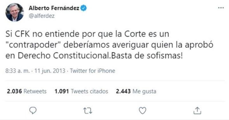 Luego, pasó a recordar un posteo en Twitter de Alberto Fernández del 2013, antes de su presidencia, el cuál decía lo siguiente: "Si Cristina Kirchner no entiende porque la Corte es un contrapoder, deberíamos averiguar quién la aprobó en Derecho constitucional, basta de sofismas".