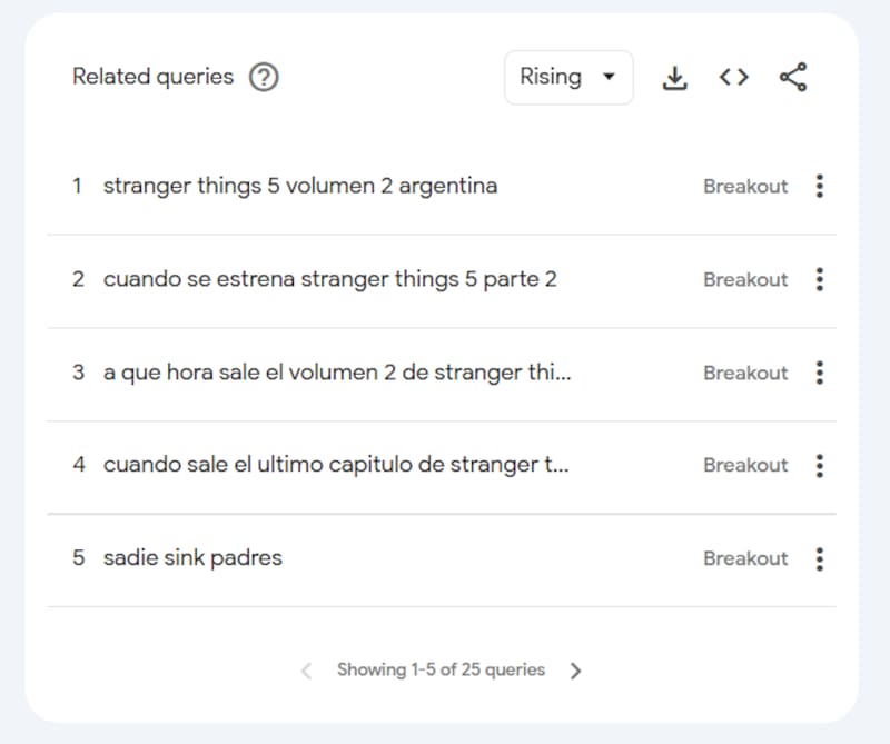 Las consultas que lideran las tendencias en estado de “Breakout” son “stranger things 5 volumen 2 argentina” y “cuando se estrena stranger things 5 parte 2”.