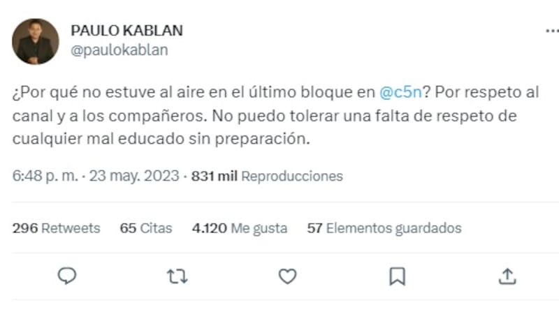 "¿Por qué no estuve al aire en el último bloque de C5N?", comenzó el cronista y respondió: "Por respeto al canal y a los compañeros. No puedo tolerar una falta de respeto de cualquier mal educado sin preparación".