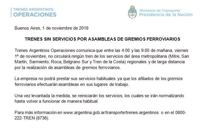 "El Sindicato La Fraternidad hace saber a la opinión pública que el día 1 de noviembre se realizarán asambleas en los lugares de trabajo en virtud de la dilación en las discusiones paritarias que las empresas ferroviarias llevan adelante con los gremios del sector", arrancó el comunicado.