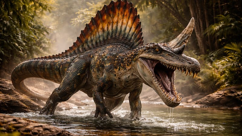 Una de las características más llamativas del Spinosaurus mirabilis es su gran cresta en forma de sable corvo. Durante años se especuló con que podría tener una función agresiva o defensiva.