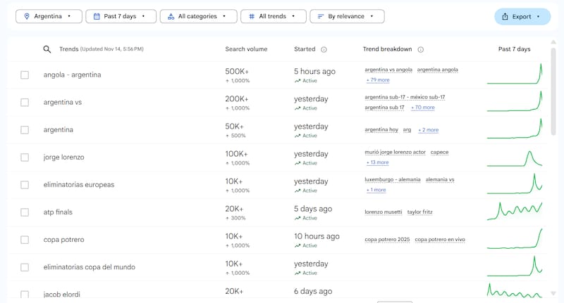 La consulta “angola - argentina” lideró el ranking con más de 500.000 búsquedas, registrando un crecimiento superior al +1.000%.