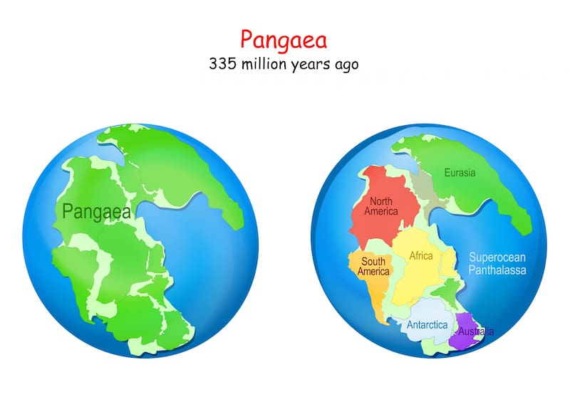 Pangea fue el último supercontinente que existió en la Tierra al final de la era Paleozoica hace 542 y 250 millones de años. Además se extendió hasta la era Mesozoica, hace 65 millones de años. Durante este período, todos los continentes se unieron en uno solo rodeado del único océano, llamado Panthalassa.