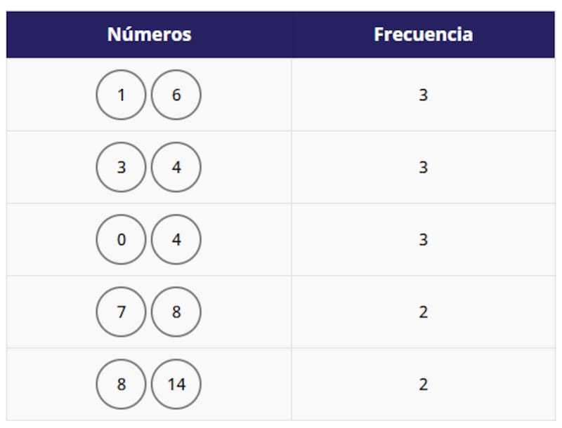 Respecto a los pares más comunes y más consecutivos, la combinación 1 y 6 lideraron con una reiteración de 3. Se continuaron 3 y 4; 0 y 4; 7 y 8 y 8 y 14.