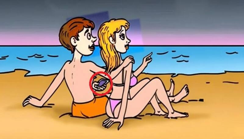 En la imagen de arriba se puede ver que el error consta en que la ilustración muestra que el joven tiene tres manos: uno apoyado sobre la arena, otro abrazando a su pareja y otro con un celular, que es la respuesta al reto.