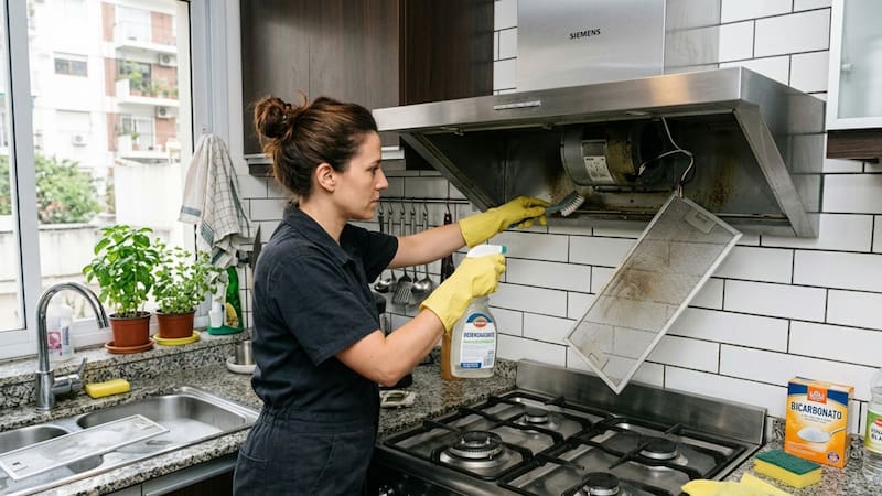 El proceso comienza con la extracción de los filtros de la campana, donde suele concentrarse la mayor cantidad de grasa. Una vez retirados, se colocan en una cubeta o en la pileta de la cocina para facilitar la limpieza.