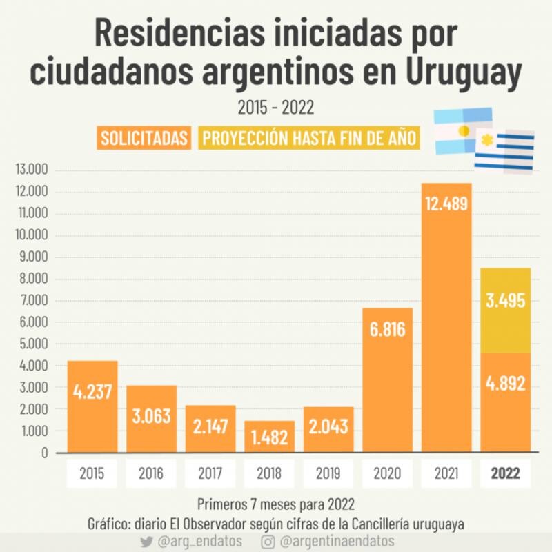 En 2021, el número de peticiones para radicarse en Uruguay alcanzó un nuevo récord. Según la cancillería, hubo 12.489 solicitudes. Si bien este ritmo se desaceleró en 2022, hasta el momento, el número total es de 4.892. La proyección indica que en los próximos 3 meses serían solicitadas casi 3.500 peticiones más.