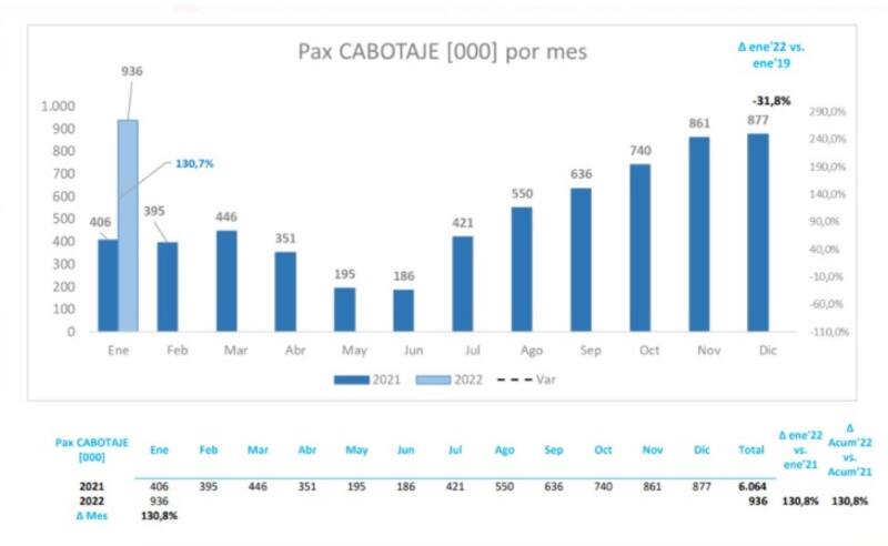 De esta manera, en enero último se registró una mejora de 130% en la cantidad de pasajeros en relación al año anterior, con 936.000 pasajeros transportados en mercado aerocomercial local.