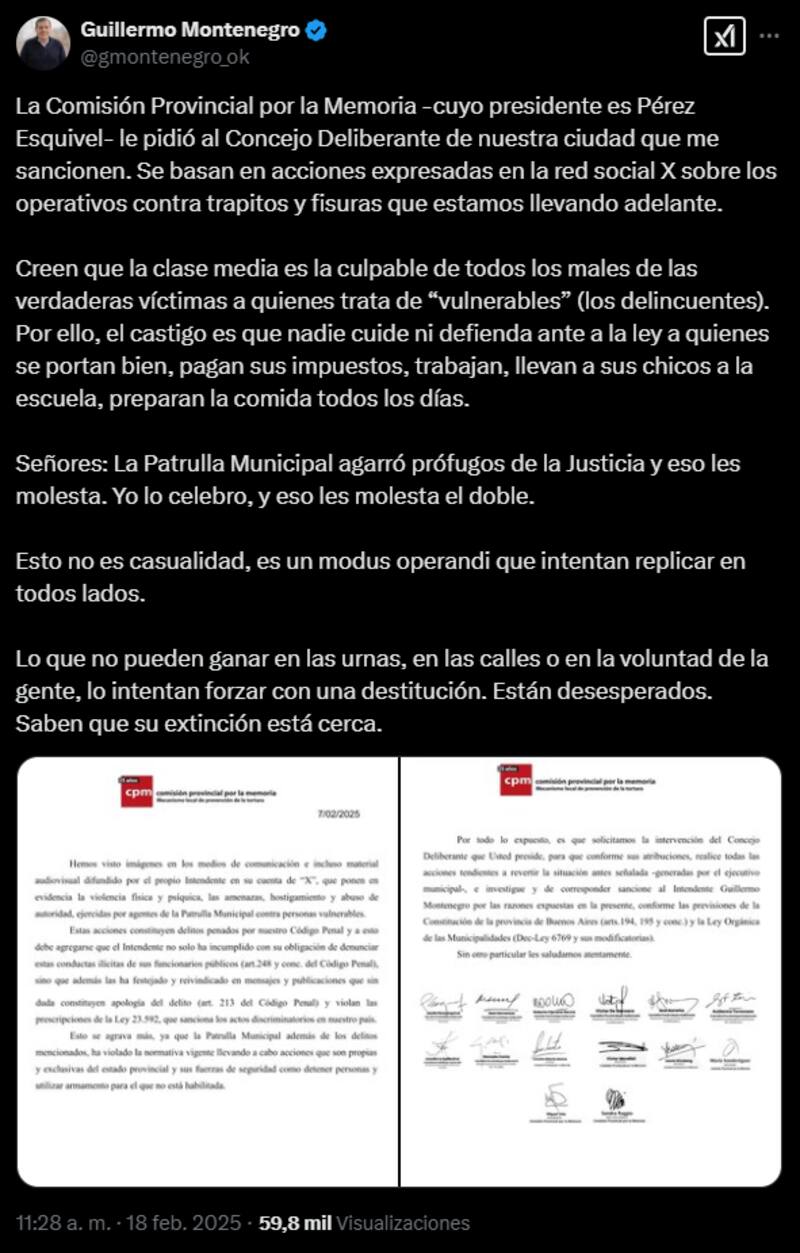 La Comisión Provincial por la Memoria (CPM), presidida por el militante kirchnerista Adolfo Pérez Esquivel, denunció penalmente al intendente de General Pueyrredón, Guillermo Montenegro, y le exigió al Concejo Deliberante del Municipio que inicie un juicio político contra él por las medidas que tomó para fortalecer la seguridad y el orden público en la ciudad de Mar del Plata.