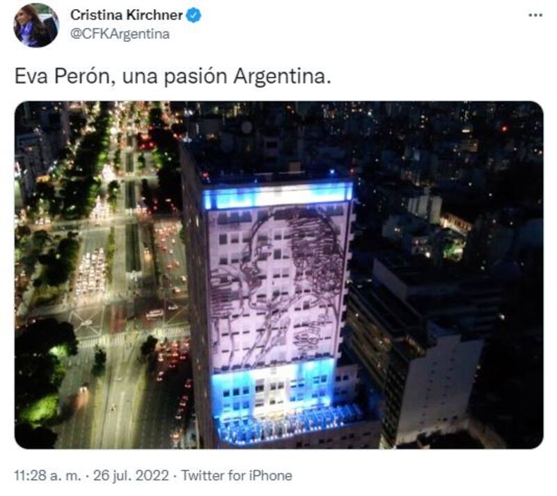 Junto a una foto del Ministerio de Desarrollo Social en la que se ve la imagen de Evita iluminada, la ex mandataria escribió: "Eva Perón, una pasión argentina".